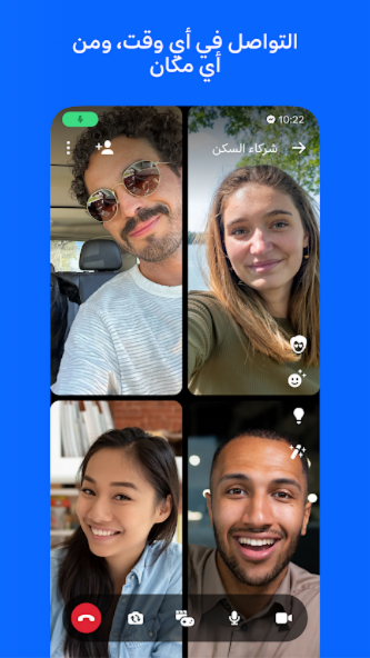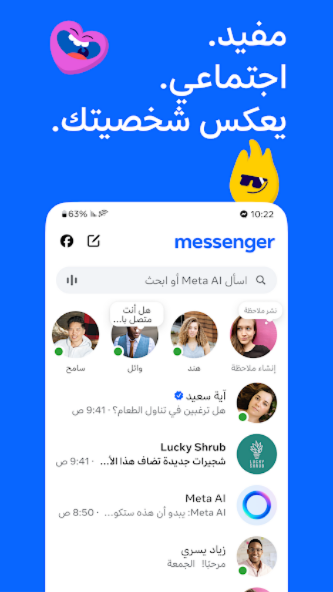 Messenger هو تطبيق مراسلة مجاني يساعدك في التواصل مع أي شخص في أي مكان. يمكنك البقاء على تواصل مع أصدقائك وعائلتك واستكشاف اهتماماتك مع أشخاص مثلك وتعزيز مجتمعك ومشاركة حالتك المزاجية التي يصعب وصفها، كل ذلك في تطبيق واحد. الدردشة والتواصل مع أي شخص في أي مكان ابحث عن أصدقائك وعائلتك وتواصل معهم على فيسبوك وMessenger، دون الحاجة لرقم هاتف. الحصول على إجابات فورية من مساعد الذكاء الاصطناعي* Meta AI هو مساعدك الذي يمكنه الإجابة عن أي أسئلة وتقديم النصائح لك ومساعدتك في أداء الواجبات المنزلية، وغير ذلك المزيد. إرسال صور بدقة عالية أرسل واستقبل صورة أكثر وضوحًا ونقاءً للحظاتك المفضلة مع Messenger. إنشاء ألبومات مشتركة أنشئ ألبومات من الصور ومقاطع الفيديو لمشاركتها وتنظيمها واستعادة ذكريات اللحظات المهمة في دردشاتك الجماعية، بدءًا من العطلة الصيفية الأخيرة ووصولاً إلى عيد ميلاد جدتك الثمانين. إضافة جهات تواصل جديدة بسهولة باستخدام رموز QR تواصل مع الأشخاص الذين تقابلهم في الحياة الواقعية عن طريق مسح رمز QR الخاص بـ Messenger ضوئيًا أو مشاركة رمزك عبر رابط. مشاركة الملفات الكبيرة مباشرة في الدردشة سواء كان مستند Word أو PDF أو Excel، يمكنك إرسال ملفات كبيرة يصل حجمها إلى 100 ميغابايت مباشرة داخل Messenger. تعديل الرسائل وإلغاء إرسالها هل تعجلت في الضغط على الزر إرسال؟ يمكنك تعديل الرسالة لمدة تصل إلى 15 دقيقة بعد إرسالها الرسائل المؤقتة ليس من المفترض أن تظل بعض الأشياء للأبد. اختر مدة بقاء دردشاتك المشفرة تمامًا بين الطرفين بعد قراءتها. الاجتماع مع مجتمعاتك تواصل بشكل هادف مع الأشخاص المشابهين لك في مدرستك وحيك ومجموعات اهتماماتك. كن جزءًا من الدائرة المقربة لمنشئي المحتوى المفضلين لديك ابق على اطلاع دائم بمنشئي المحتوى من خلال الانضمام إلى قنوات الرسائل الجماعية للحصول على محتوى أصيل وغير رسمي. إطلاق العنان لخيالك باستخدام META AI* استفد من شريكك المبدع لإنشاء وتعديل وتحريك الصور وغير ذلك المزيد. توثيق لحظاتك اليومية في القصص أبرز لحظات يومك من خلال صور ومقاطع فيديو تختفي بعد 24 ساعة في القصص. كتابة ملاحظة تعبر عن أفكارك ابق على تواصل مع أصدقائك من خلال مشاركة التحديثات السريعة التي تختفي بعد 24 ساعة. إظهار حالتك المزاجية في دردشاتك أحيانًا لا تفي الكلمات بالغرض. استفد من الطرق الإضافية لتقوم بالتعبير عن نفسك باستخدام الملصقات المتحركة وصور GIF والتفاعلات وغيرها. هيأ الحالة المزاجية لدردشاتك باستخدام السمات خصص دردشاتك بمجموعة كبيرة ومتجددة باستمرار من السمات تعرض فنانين معروفين وعطلات، وغير ذلك المزيد. * يتوفر Meta AI بلغات وبلدان مختارة فقط، وسيتوفر المزيد منها قريبًا.
