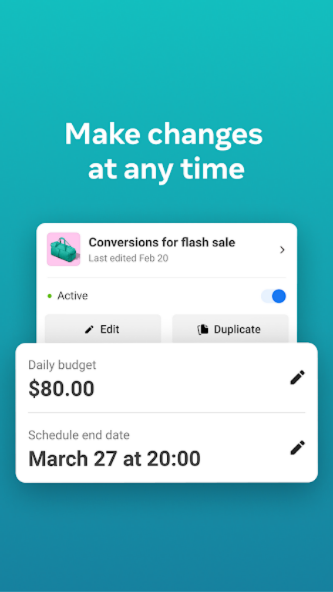 الاستمرار في متابعة حملاتك الإعلانية، أينما كنت. يمكنك إنشاء الإعلانات وتعديلها والحصول على رؤى بشأنها على مستوى مجموعة تطبيقات فيسبوك بالكامل، بما في ذلك فيسبوك وInstagram وMessenger وواتساب، وغيرها الكثير. ● عرض رؤى تفصيلية فورية من كل حملاتك الإعلانية ● تشغيل الحملات الإعلانية وإيقاف تشغيلها ● الحصول على تنبيهات سريعة للتعرف على ما يحدث لكل إعلاناتك ● مقارنة حملاتك الإعلانية ومجموعاتك الإعلانية من خلال عرضها جنبًا إلى جنب ● التبديل بين الصفحات والحسابات الإعلانية